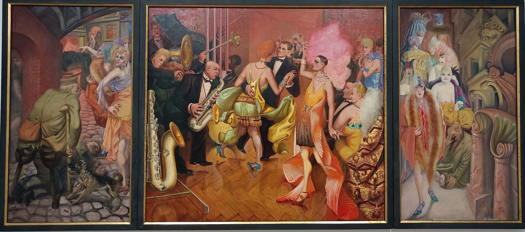In questo trittico Dix rappresenta al centro l'opulenta società tedesca che si diverte mentre ai lati sono raffigurati